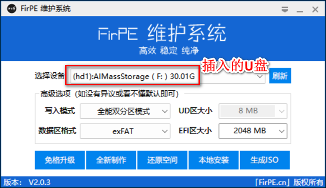 4、打开下载的 FirPE 程序,设备这里会自动识别插入的U盘。