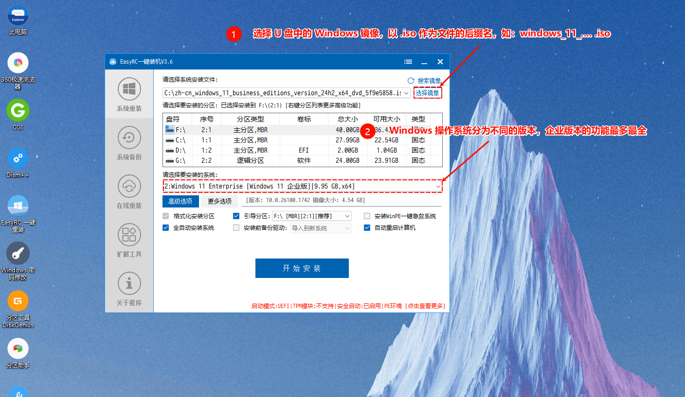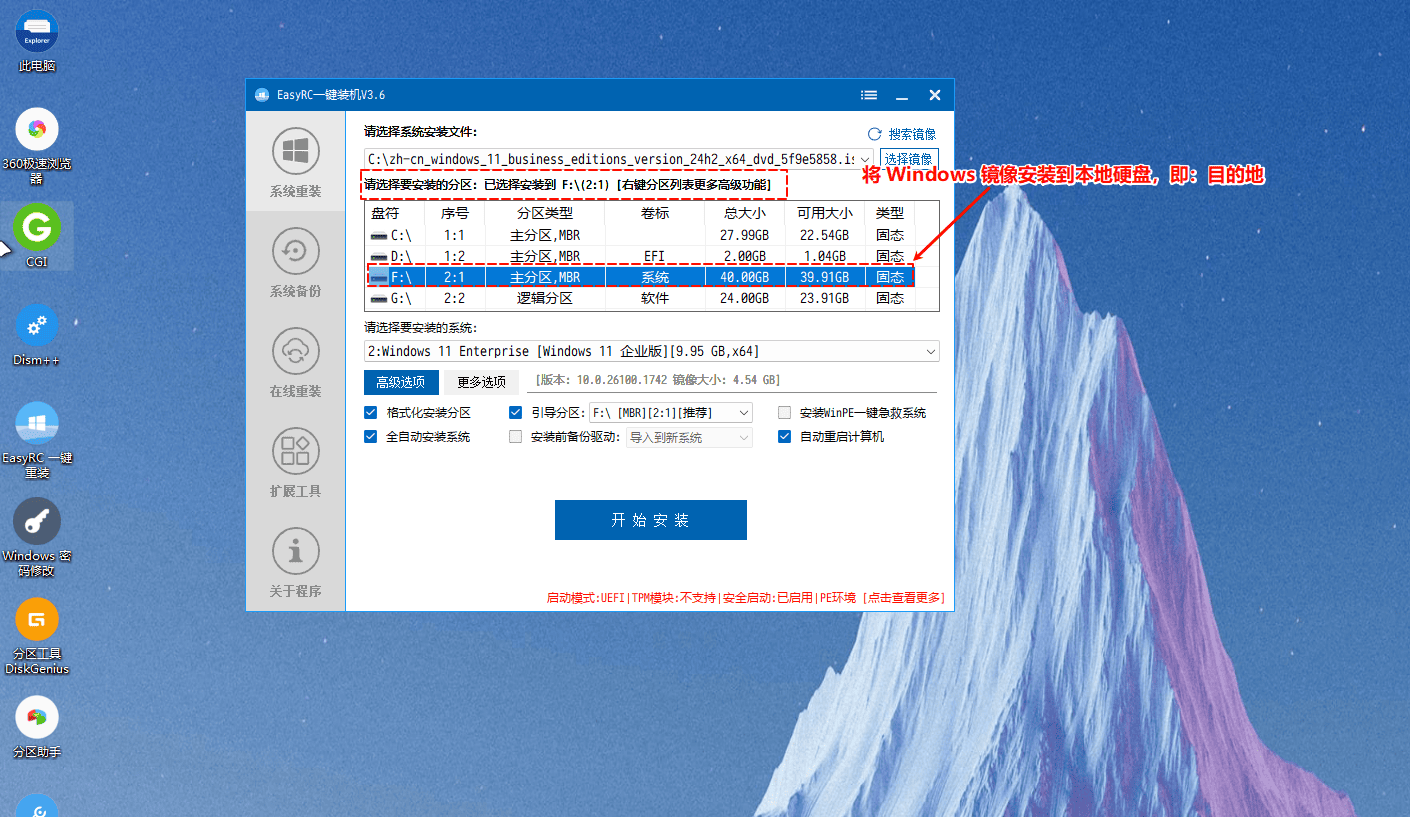 4、点击开始安装,等待一段时间安装完成关闭EasyRC软件 5、在 WinPE 中选择重启系统,拔出 U 盘,进入 Windows 安装过程,安装过程中可能会多次重启请耐心等待